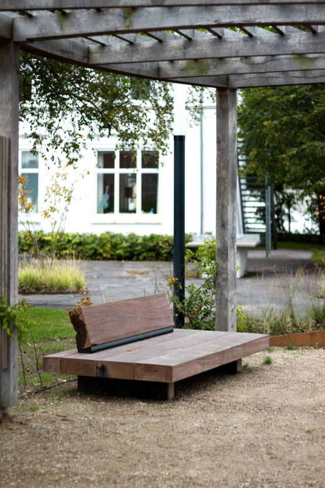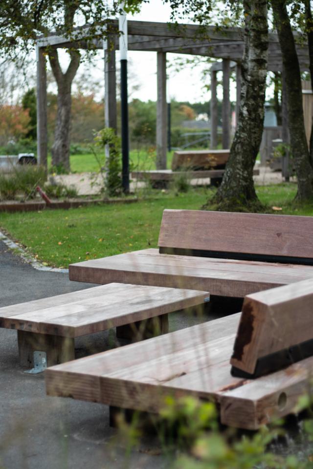 I etableringen af terapihaven på Vestre Kirkegård var målet at skabe et stille og helende rum, hvor naturen kunne invitere til ro og fordybelse. Her blev genanvendt azobétræ brugt til møbler og specialløsninger, der understøtter havens rolige æstetik og harmonerer naturligt med omgivelserne. Træets tidløse udtryk gør det til en diskret, men markant del af helheden – og bidrager til, at haven opleves som et sanseligt åndehul midt i byen.