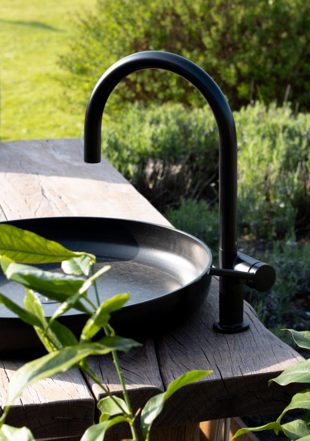 Åben op for en verden af muligheder ved at tilvælge en vask til dit udekøkken! Brug det som grovkøkken efter du har høstet afgrøder i din køkkenhave, sluk tørsten uden at skulle have skoene af og tilbered hele aftenens måltid under åben himmel! Til dit SAVRA udekøkken følger en massiv varmegalvaniseret stålvask med elegant C-tud og lækker finish med åbne-lukke funktion indsat direkte i bordpladen. Til dit NOR udekøkken følger en flad stålvask pulverlakeret i matsort. Du vælger selv i hvilken side af udekøkkenet vasken skal placeres.