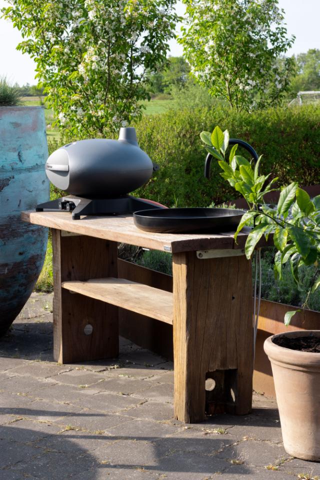 Under bordet er der en riste til opbevaring af gryder, grillkul eller vandtætte bokse med låg til de ting du bruger mest i dit udekøkken, såsom salt, pepper og olivenolie. Risten er af samme dimensioner (70x100 cm) lige meget hvilket størrelse bord du vælger, da den frie plads tillader dig at opbevare en gasflaske til grillen og andre større ting. Men hvis du ønsker det, kan vi indsætte flere riste under dit bord.